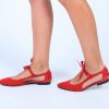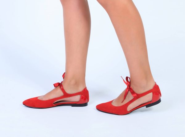 Sabrina em pele de camurça vermelha com parte de trás em pele de verniz vermelha, fita em cetim vermelho, forro e palmilha de conforto em pele, sola neolite antiderrapante