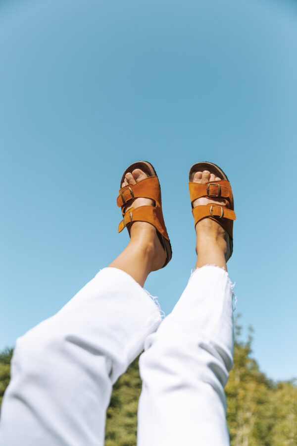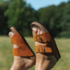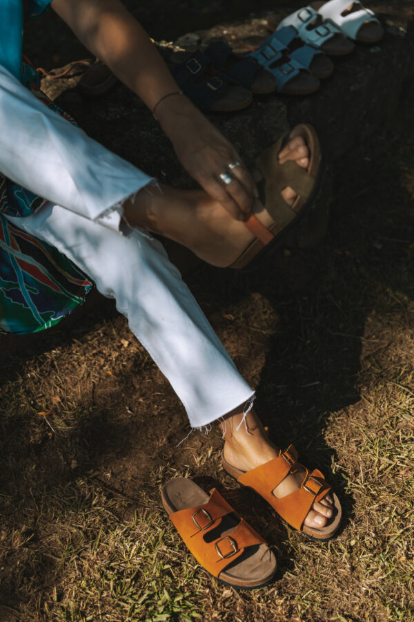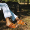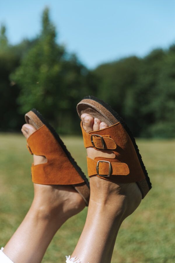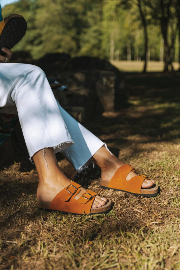 Sandália em pele crute ocre, com forro e palmilha anatómica de conforto em pele, sola antiderrapante