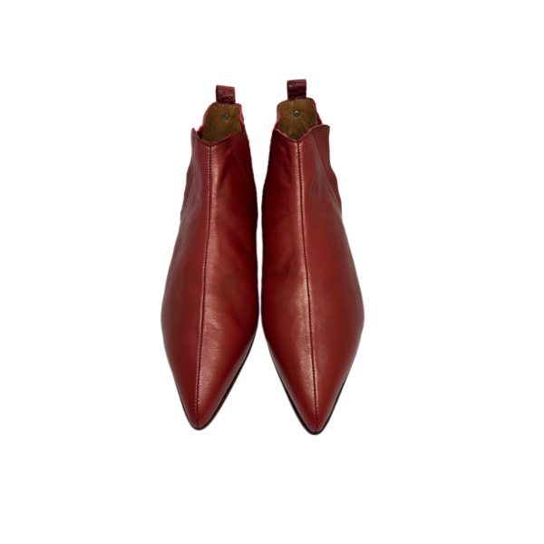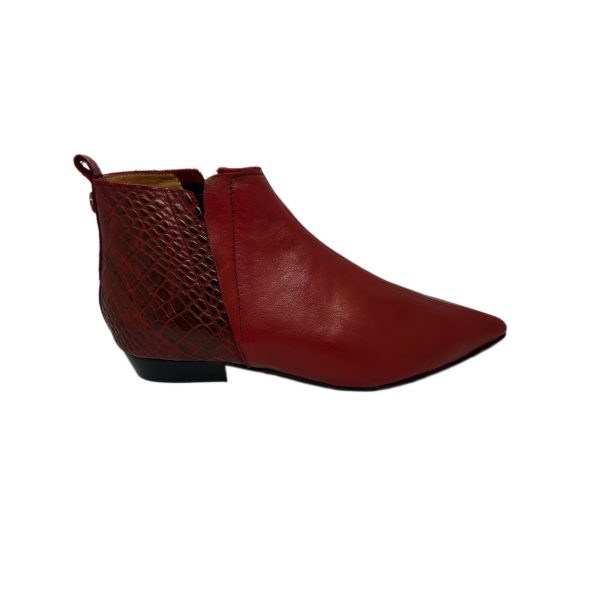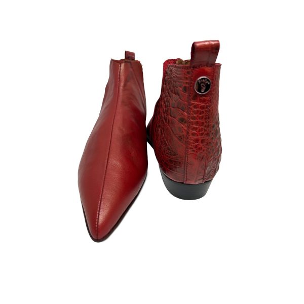 Bota em pele sauvage red, traseiro pele chapa crocodilo red, forro e palmilha super conforto em pele, sola antiderrapante com salto preto 2.5cm altura
