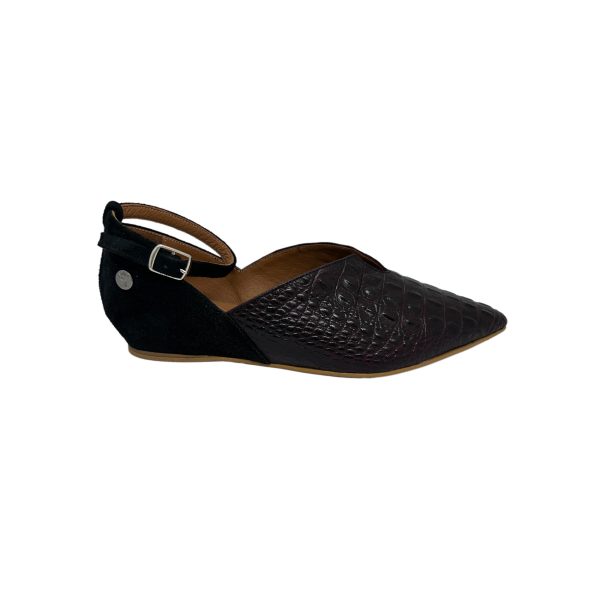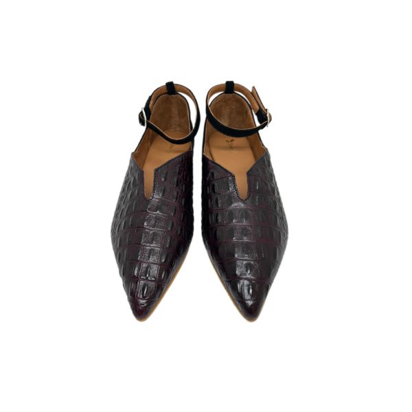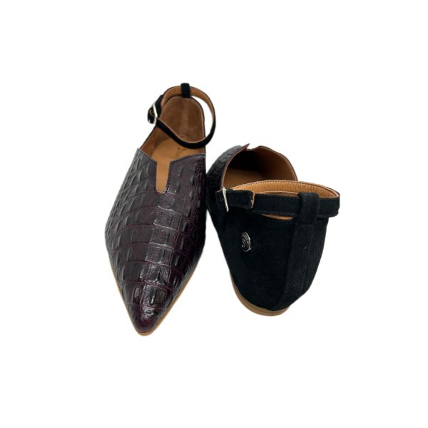 Sapato em pele chapa crocodilo bordeaux, com nuances escuras com traseiro em pele crute preta, forro e palmilha de super conforto em pele, inclui uma cunha embutida de 2.5cm de altura, sola antiderrapante